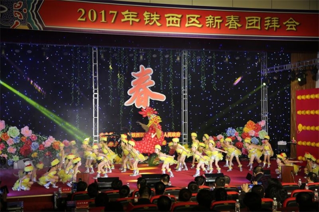 在随后进行的文艺演出中,全区各届群众表演了丰富多彩的文艺节目。气势恢宏的舞蹈表演《小鸡进行曲》,拉开了本场演出的大幕;由区四个班子代表表演的诗朗诵《祖国啊,我为你自豪》,表达了对祖国母亲的热爱与赞美,展示了区级领导班子团结拼搏、奋发向上的崭新面貌;英雄街社区工作人员表演的群口快板《金鸡报春唱铁西》,汇报了过去一年社区建设取得的成绩,展示了全区广大居民安居乐业的良好局面;红歌联唱《跟着咱领袖毛泽东》、《南泥湾》、《走向复兴》、《五星红旗迎风飘扬》等节目不断把演出推向了高潮。