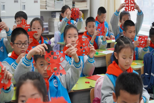 剪纸课堂上,老师带来精品课程《百变团花》,以非遗剪纸为载体,精讲传统技法、深挖纹样寓意,启发学生创意创作。教学采用折剪结合、由浅入深的方式,融审美教育与文化传承于一体。孩子们动手勾勒、裁剪、雕琢,在方寸红纸间感受民间艺术的精巧雅致,体悟传统纹样里的美好寓意。
