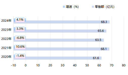 在限额以上单位商品零售额中,粮油、食品类零售额比上年增长8.7%,饮料类零售额比上年下降28.4%,烟酒类零售额比上年下降33.7%,服装、鞋帽、针纺织品类增长47.2%,化妆品类下降62.2%,金银珠宝类下降47.8%,日用品类增长196.1%,家用电器和音像器材类下降13.4%,中西药品类增长9.2%,文化办公用品类下降39.3%,通讯器材类增长5.2%,石油及制品类增长15.5%,汽车类增长0.6%。
