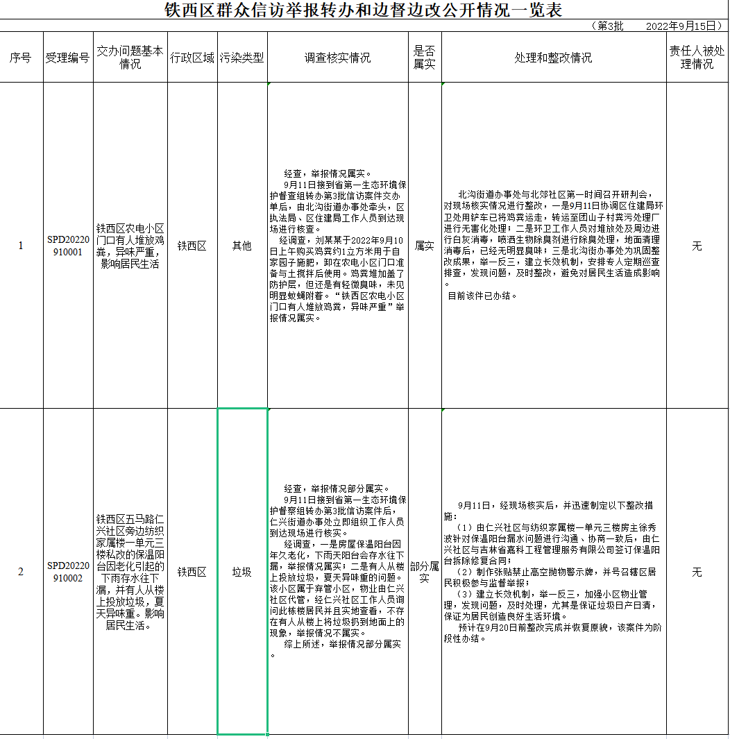 铁西区群众信访举报转办和边督边改公开情况一览表